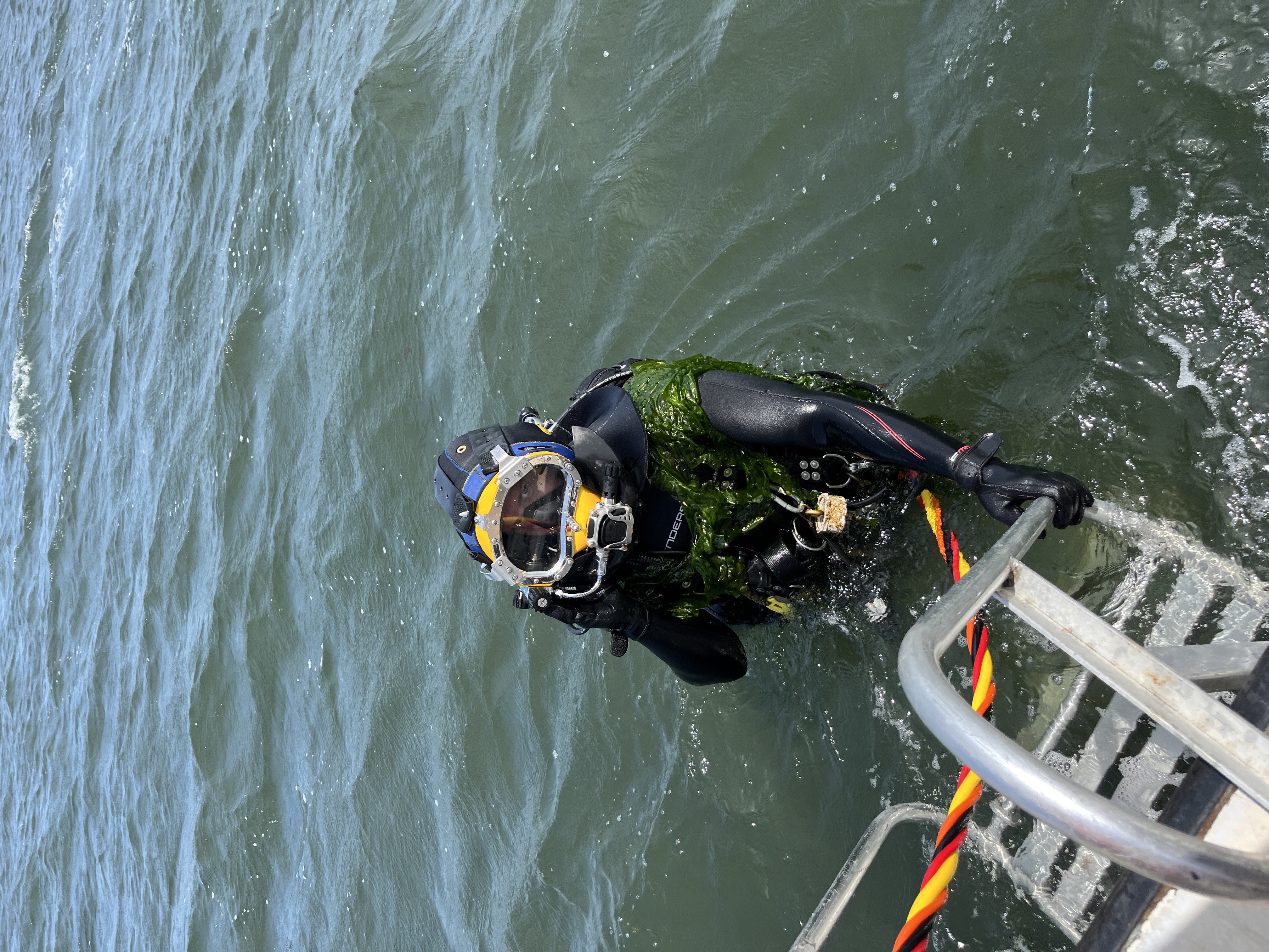 A diver with the U.S. Army Engineer Research and Development Center’s dive team returns to the boat after retrieving instrumentation placed off the coast of Long Island, New York. The dive team is assisting the U.S. Army Corps of Engineers New York District with data collection for their Fire Island to Montauk Point Project. (U.S. Army Corps of Engineers photo)